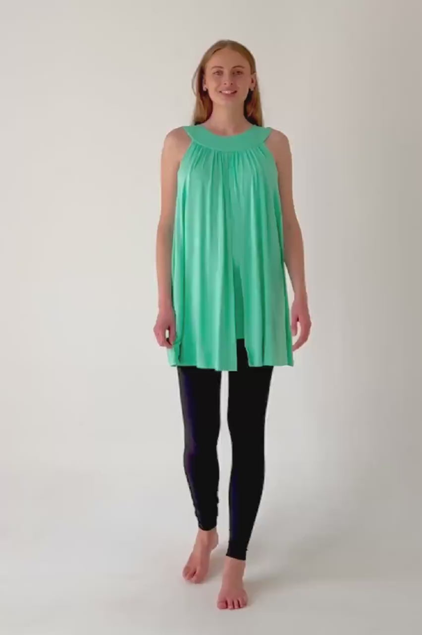 Our sleeveless tunic features a rounded neckline with gentle gathers that drape beautifully over your curves. The back neckline closes with three delicate shank buttons and loops—an elegant touch that makes this piece special from every angle.